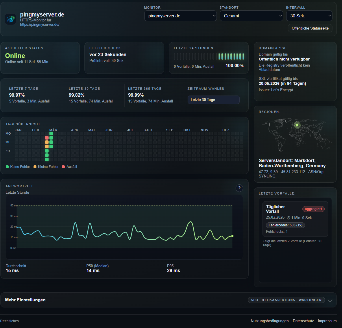 Jeder Monitor hat eine öffentliche Statusseite, die direkt verlinkt werden kann. Die Seite zeigt Echtzeit-Status, Uptime-Statistiken und vergangene Incidents. Du kannst sie auch mit deinem eigenen Branding versehen (in bezahlten Plänen).